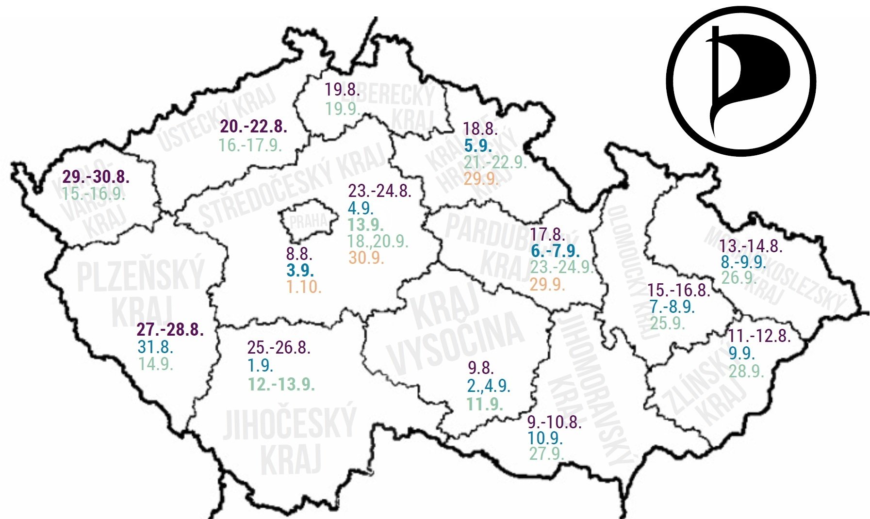 Každý den až do dne konání krajských a senátních voleb mohou občané dorazit na zastávky autobusu a debatovat s představiteli Pirátské strany. Těchto setkání se zúčastní jak jednotliví poslanci, krajští či senátní kandidáti, tak předseda strany Ivan Bartoš.